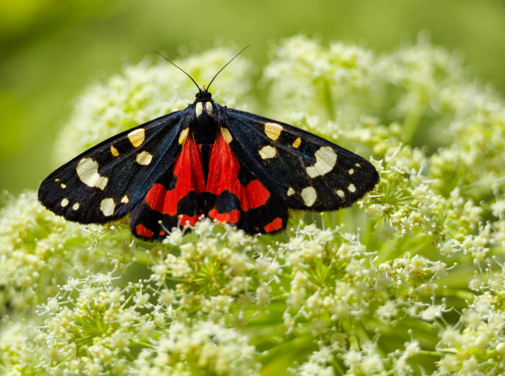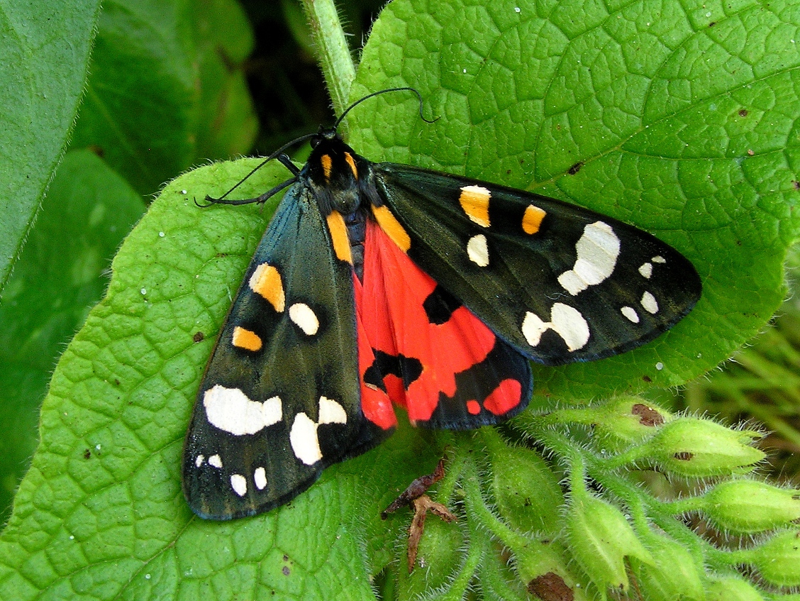 чорні крила з білими плямами та яскраво-червоні задні крила з чорними точками.