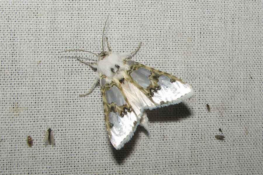 передніх крил сріблясто-білий з жовтуватим та рожевим вилиском, дві ламані