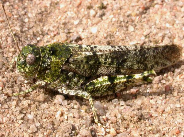 Саранові, довжина тіла 26-39 мм. Бурі чи жовтувато-бурі, покриті темними